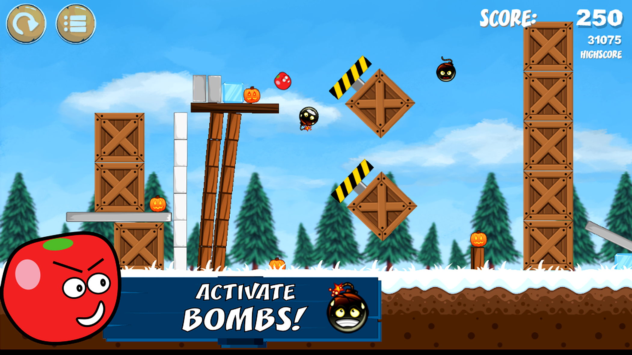 Swing the Nice tomatoes , use gravity and activate the bombs to eliminate the evil pumpkins in this free pumpkin game.